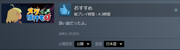 妻からも、「私の好きなストリーマーでメグと化け物のゲームを見ていたけど、泣けたわ」と感想を頂いたけど、私は成長の過程で感受性を失ってしまっていたようで、「せやな。良い話でした」としか言葉が出ませんでした。申し訳ございません。良い話でしたよ!いやほんとに!